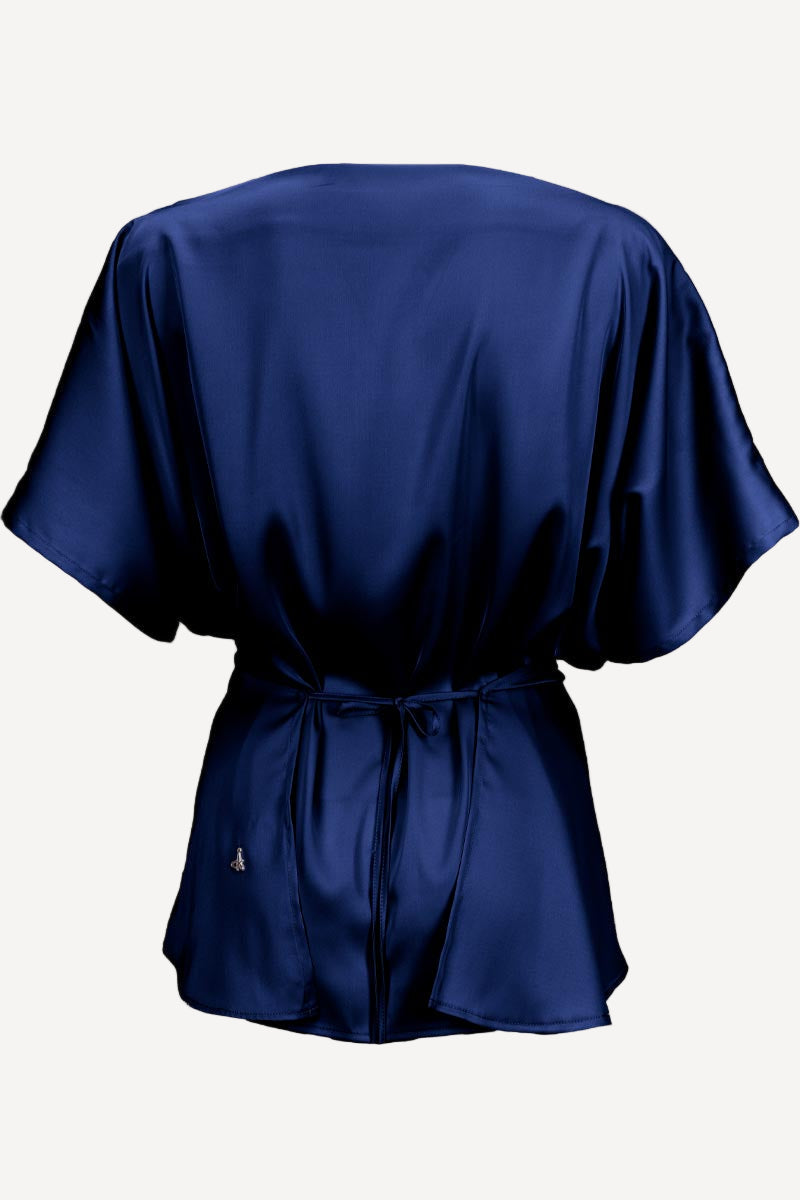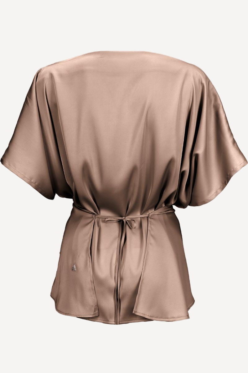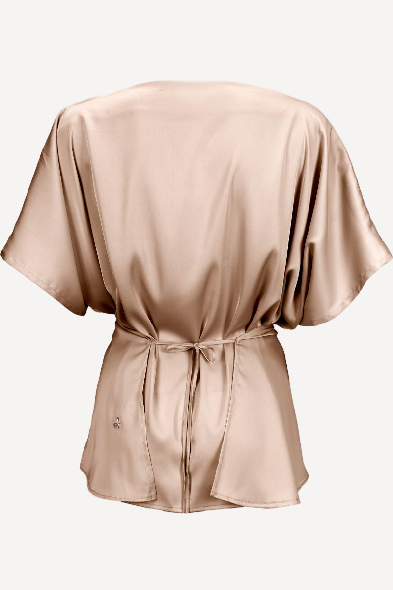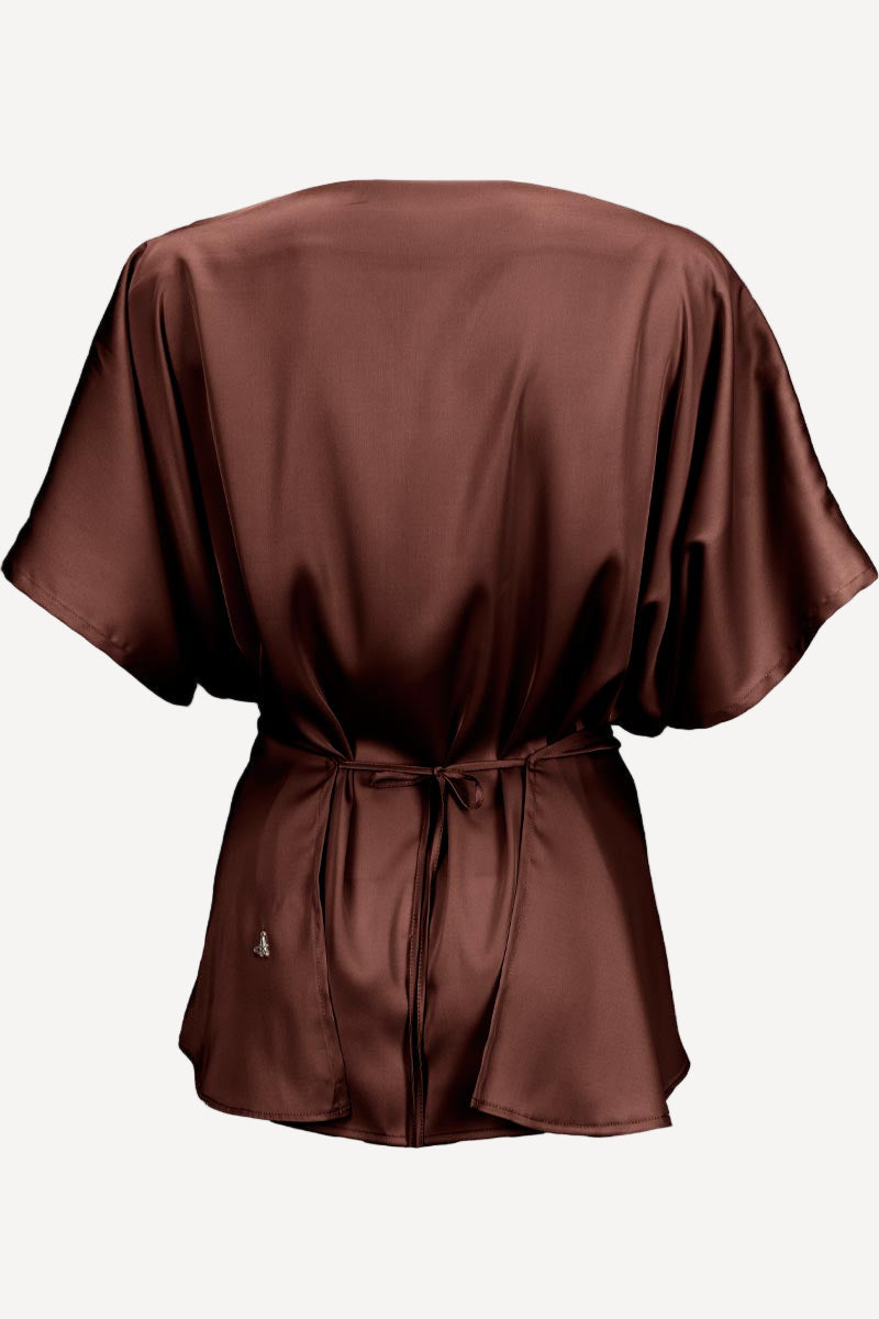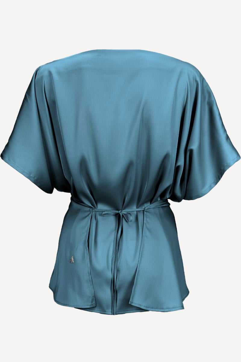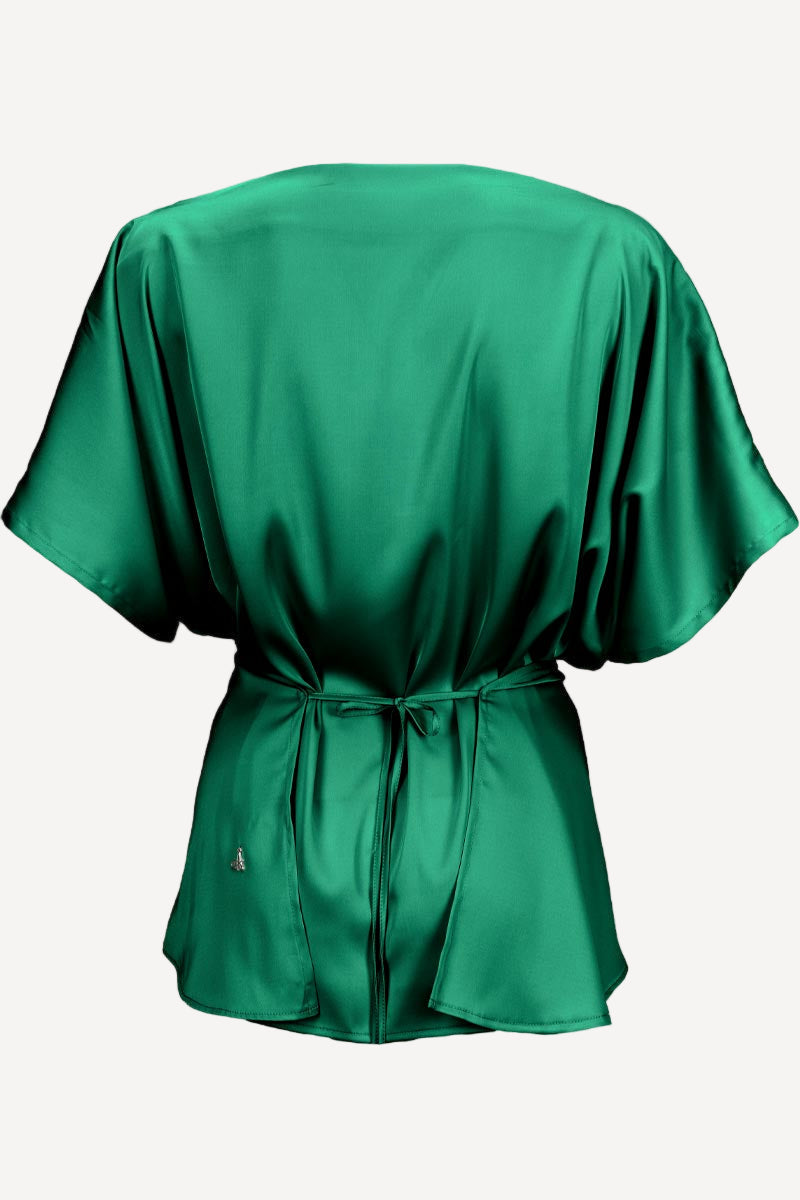 Bluza od glatkog satena sa preklopom i vezivanjem na leđima – prilagođava se tvojoj silueti i naglašava struk na najženstveniji način.