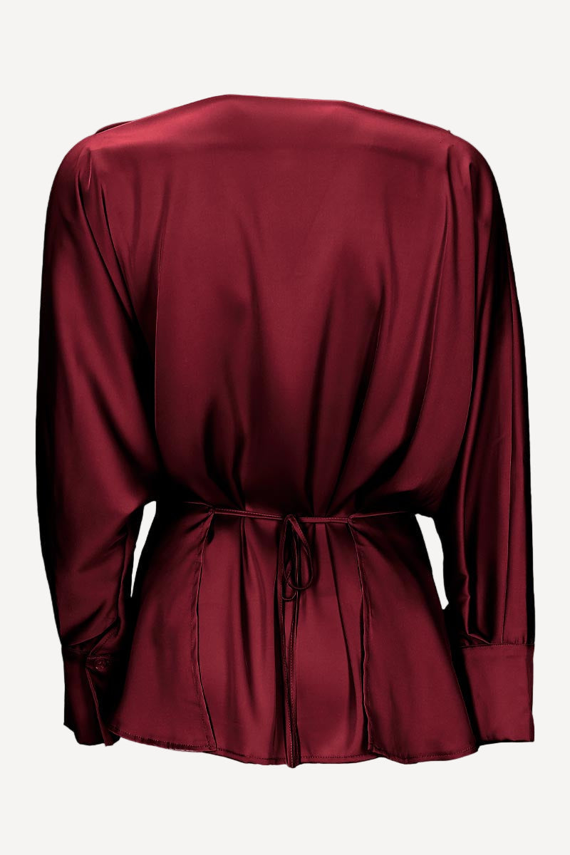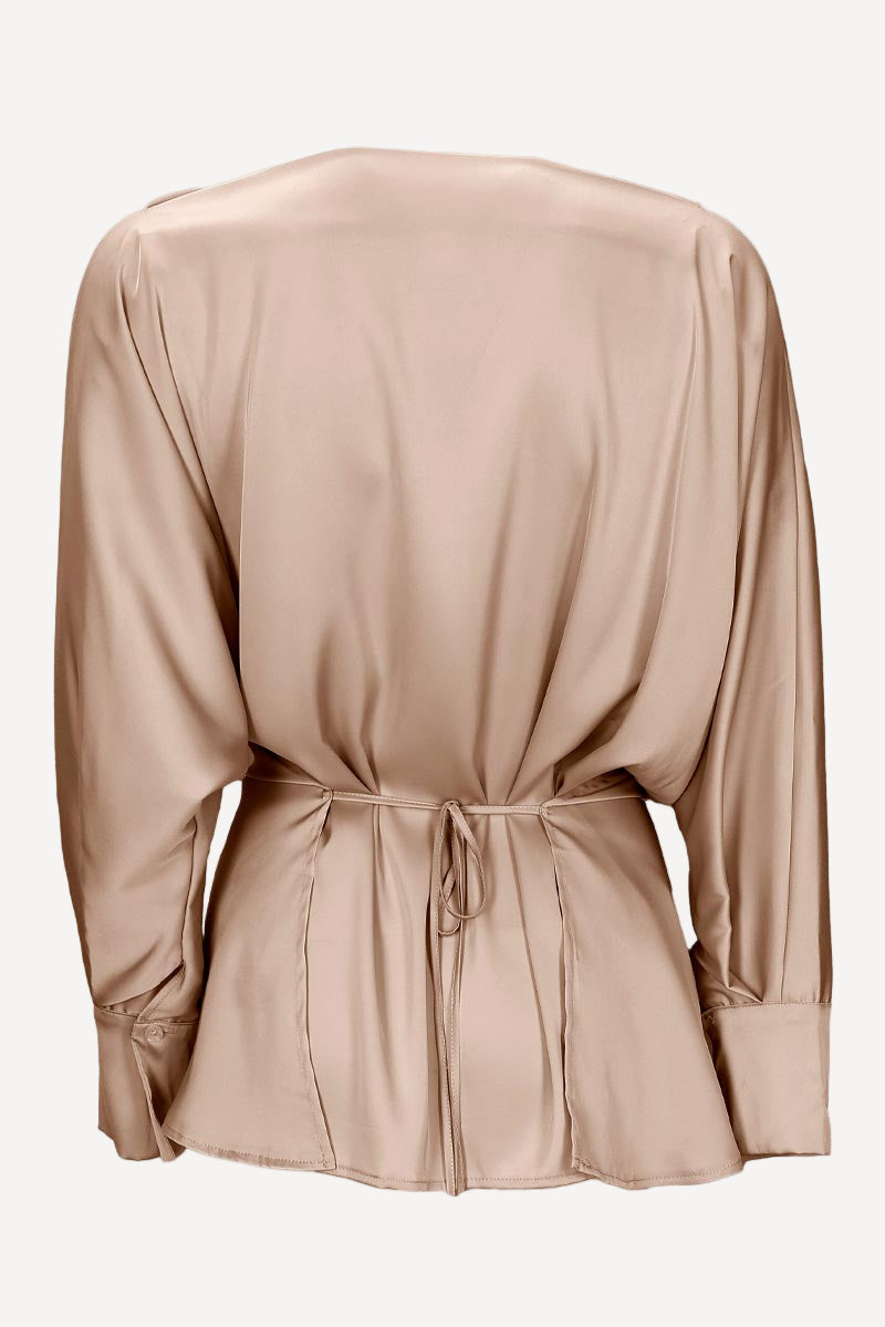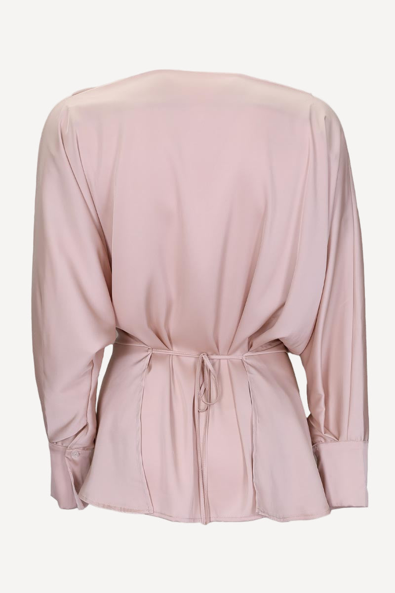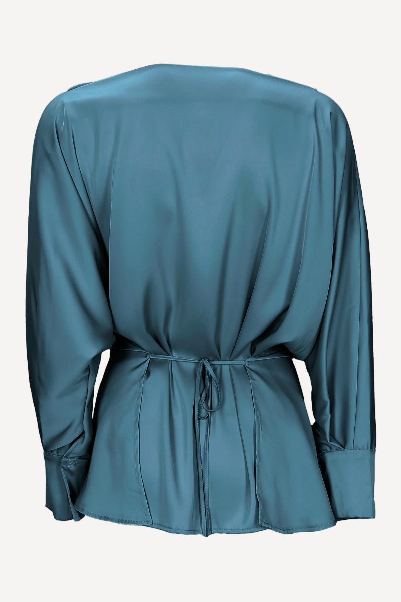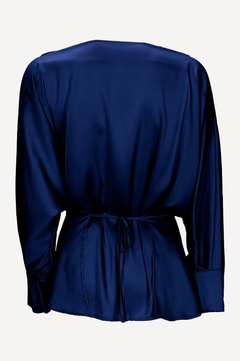 Bluza na preklop od glatkog satena u verziji sa dugim rukavima koji se završavaju finim manžetnama.