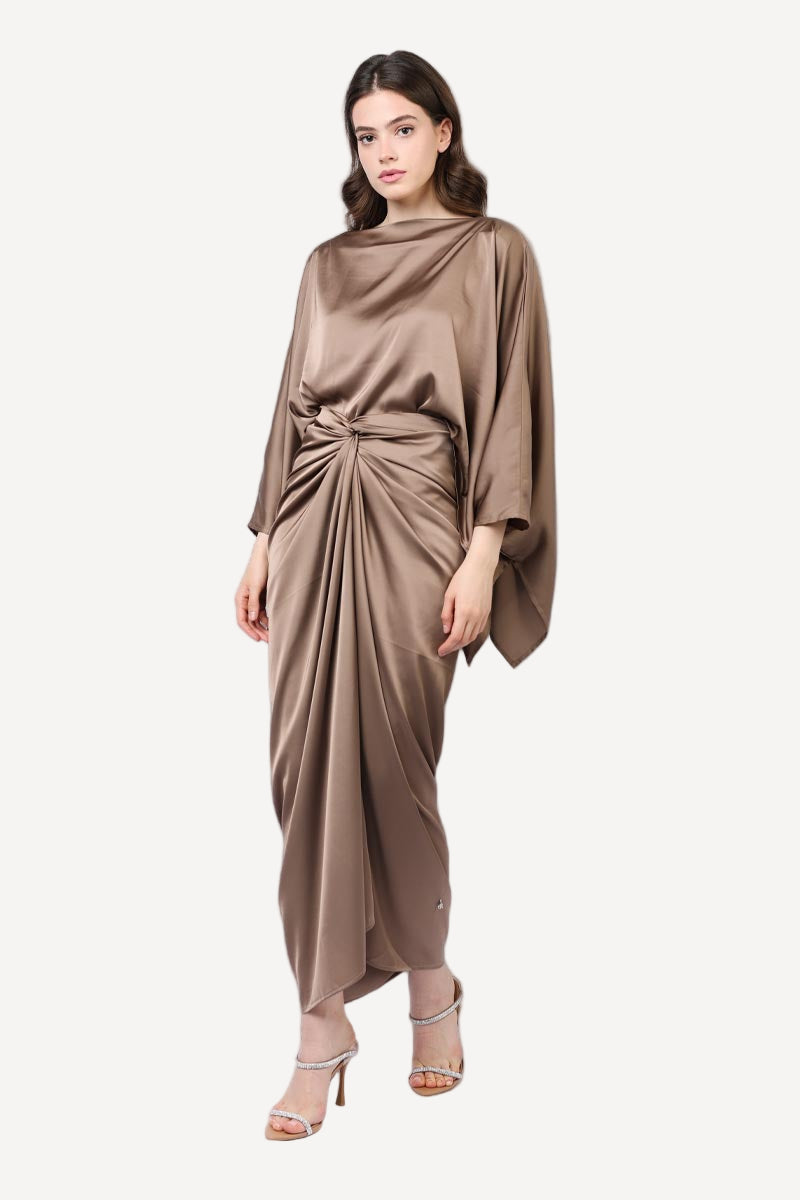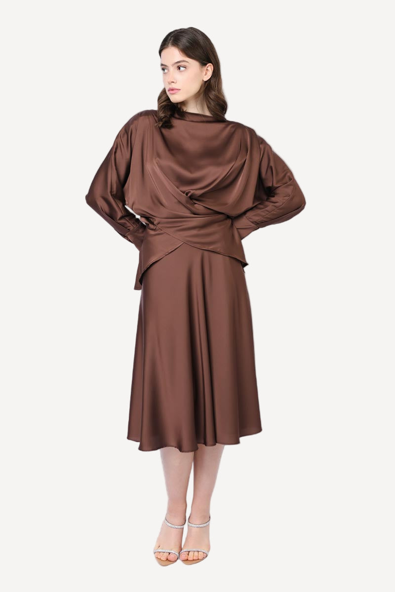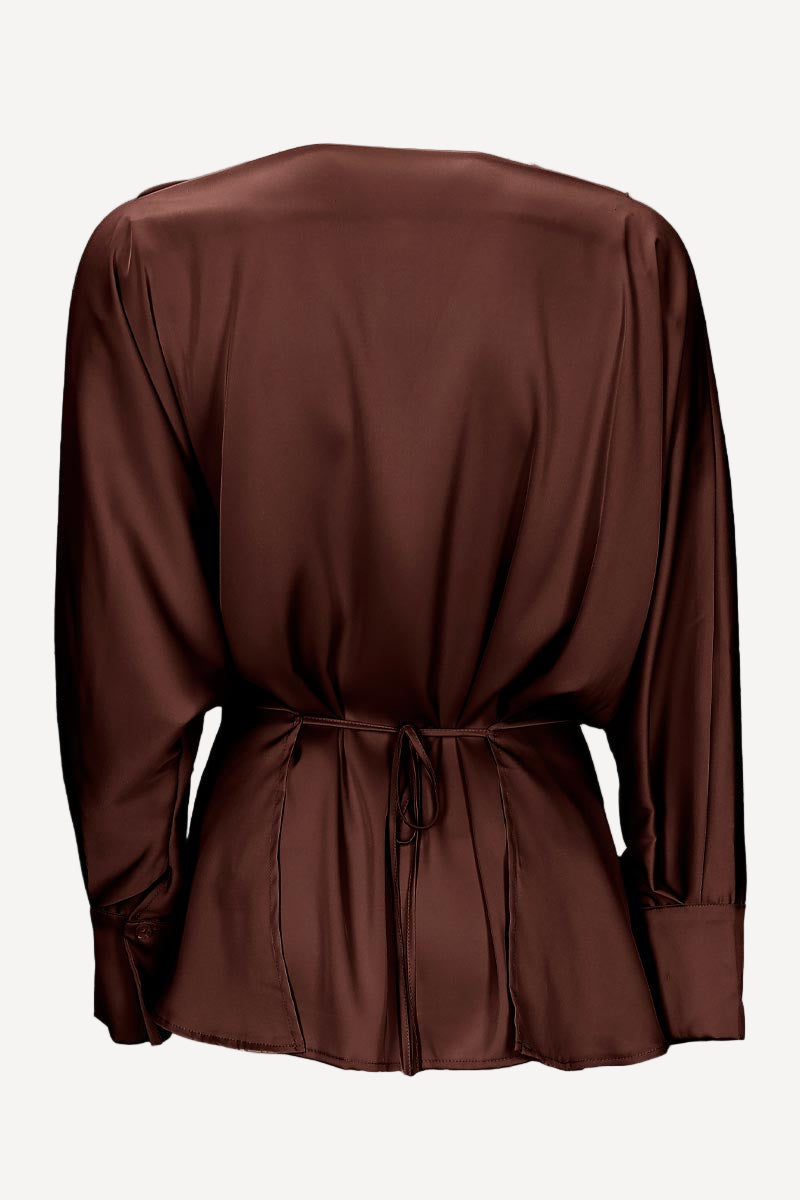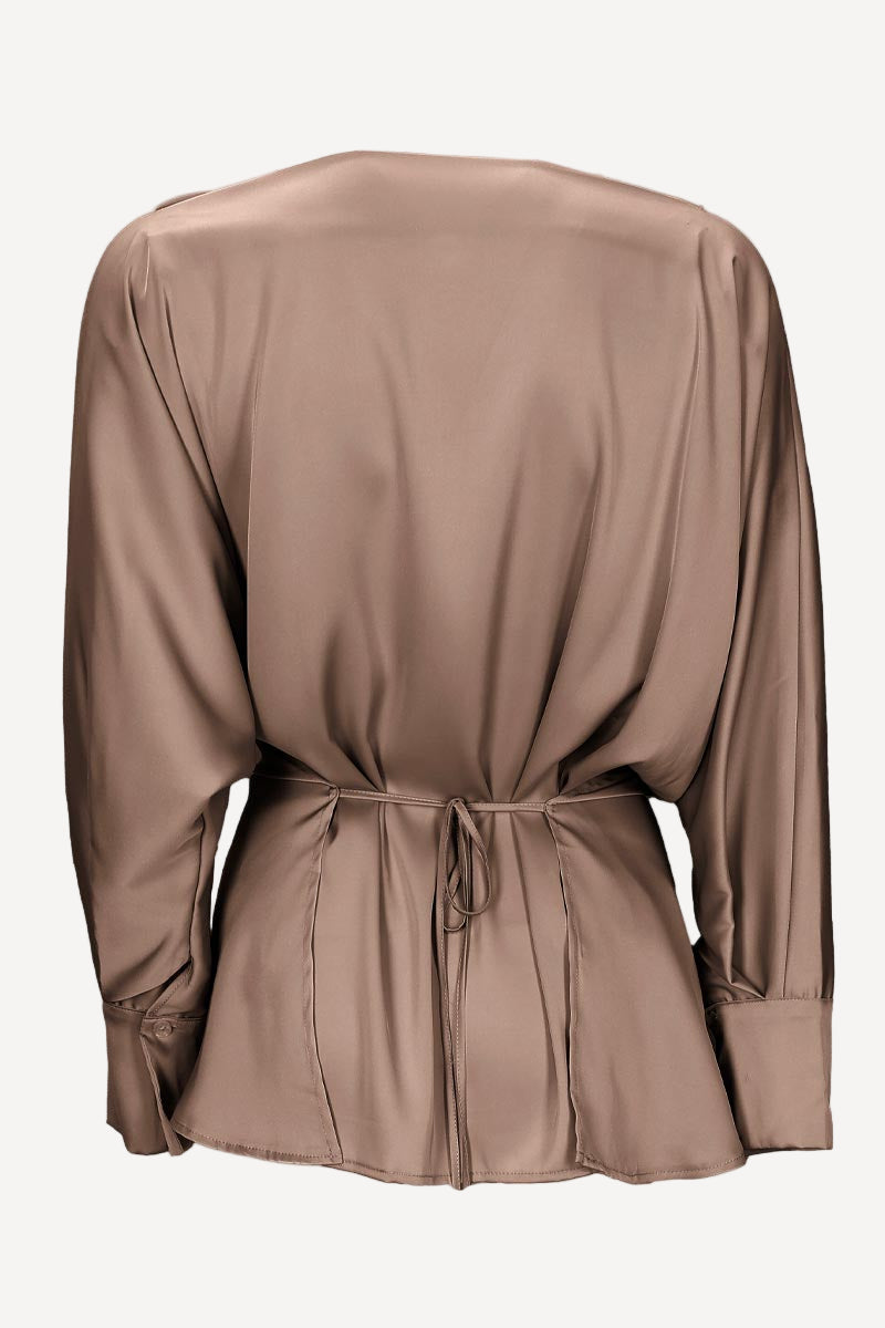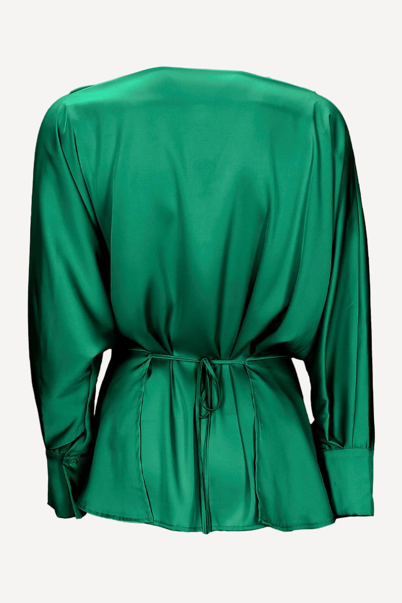 Bluza na preklop od glatkog satena u verziji sa dugim rukavima koji se završavaju finim manžetnama.